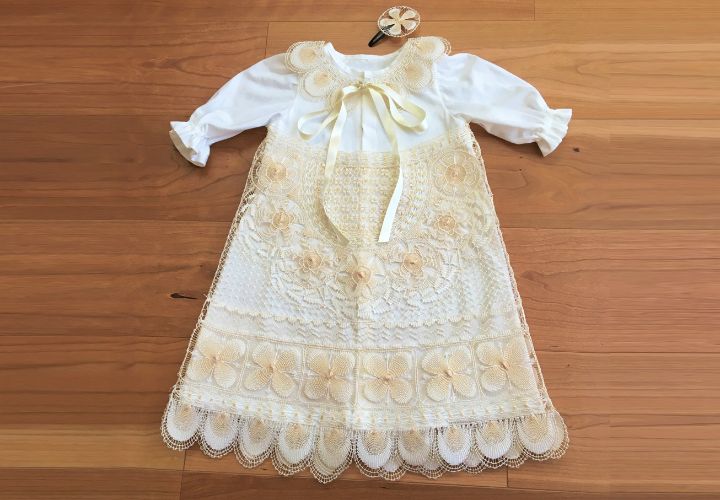 千森先生にベビードレスを作るために一つずつ教えてもらいました。